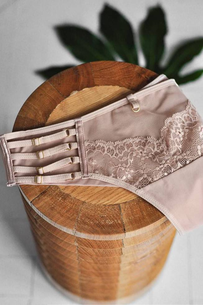 Figi typu brazyliany. Tył wysoko wycięty z podwójnego tiulu. Boczki z regulowanymi paseczkami, przód z koronką.