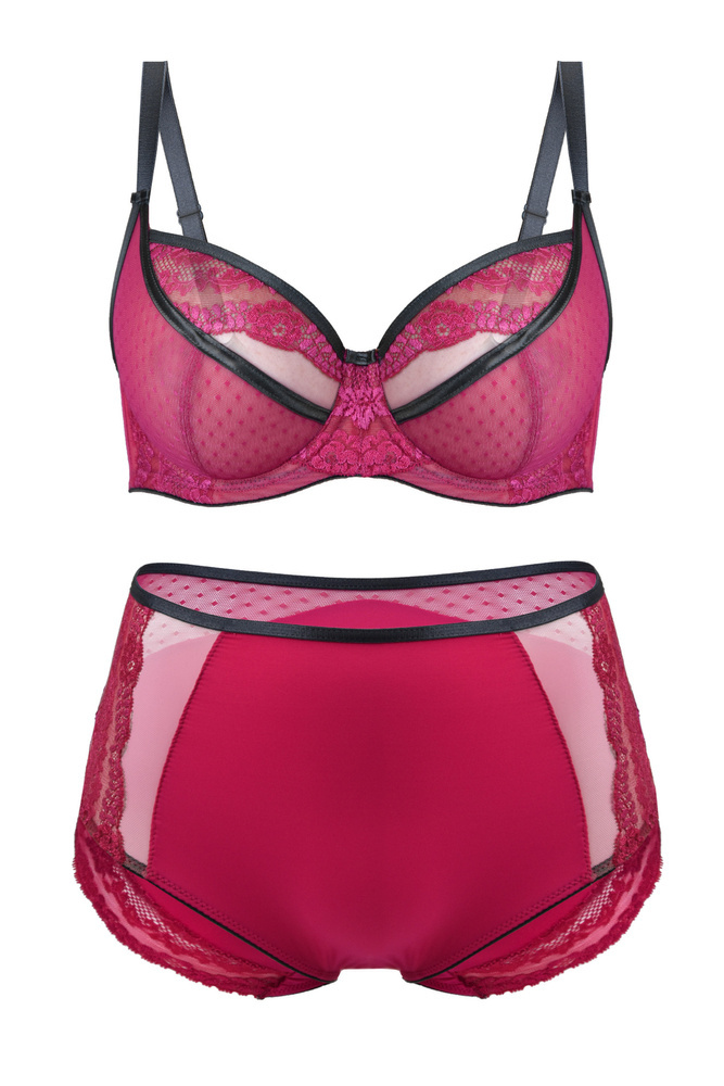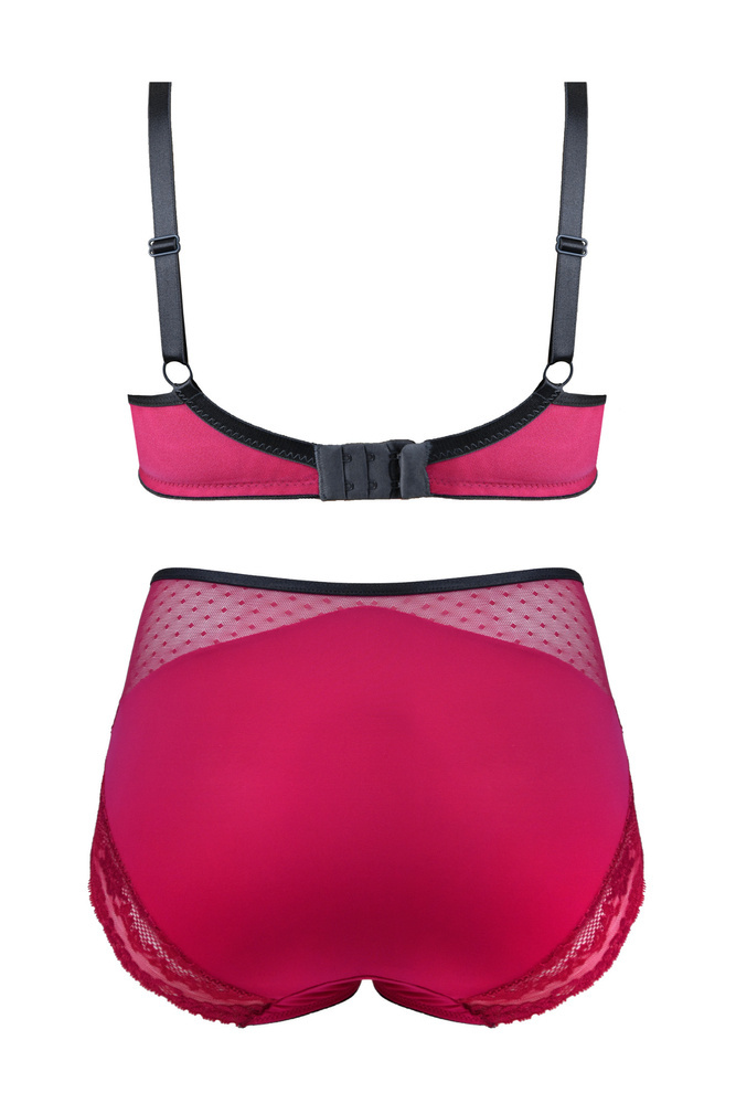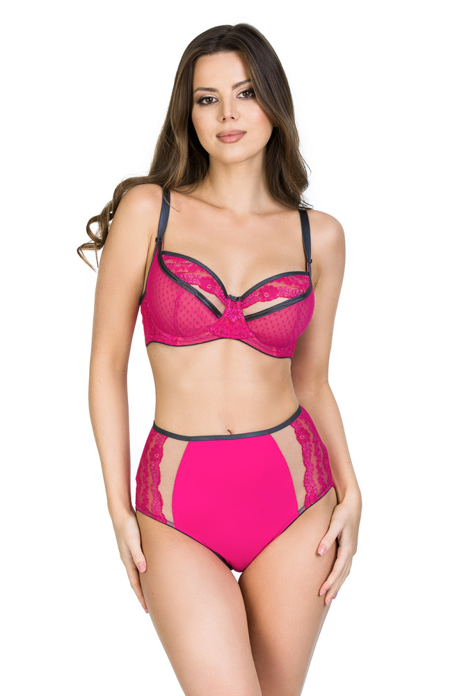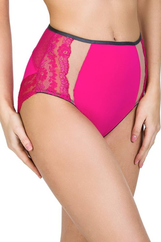 Wysokie figi z różowej mikrofibry i koronki. Przód z koronki, tył z różowej mikrofibry, dolna część wykończona na płasko.