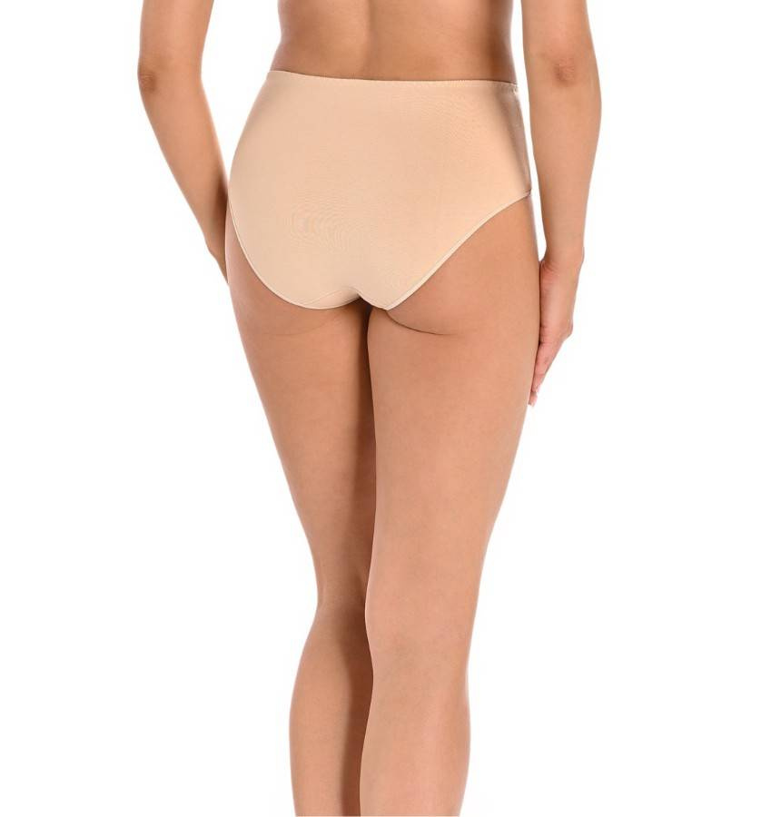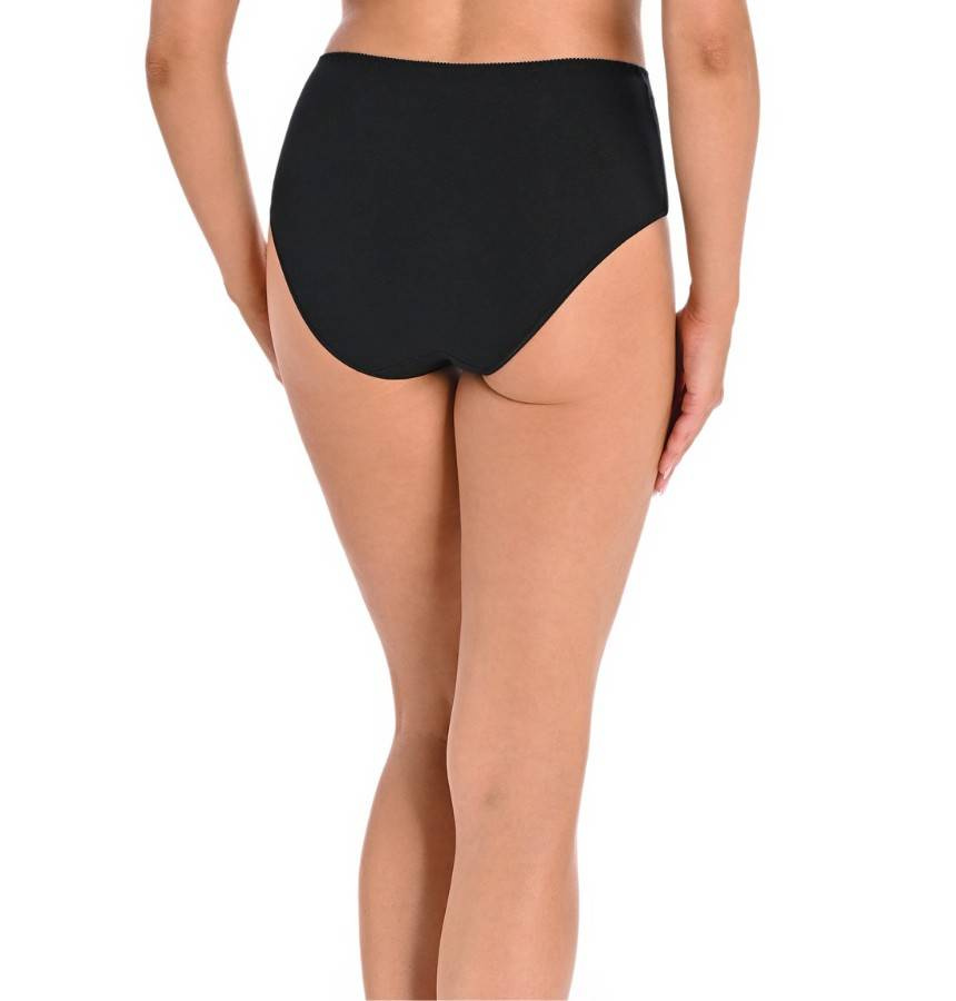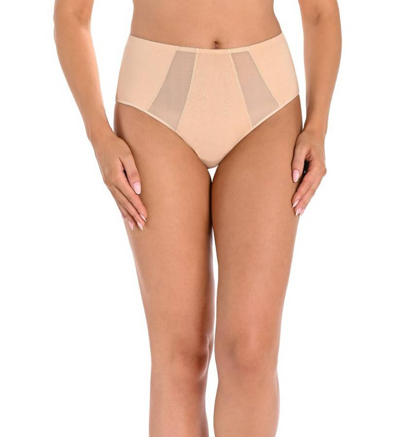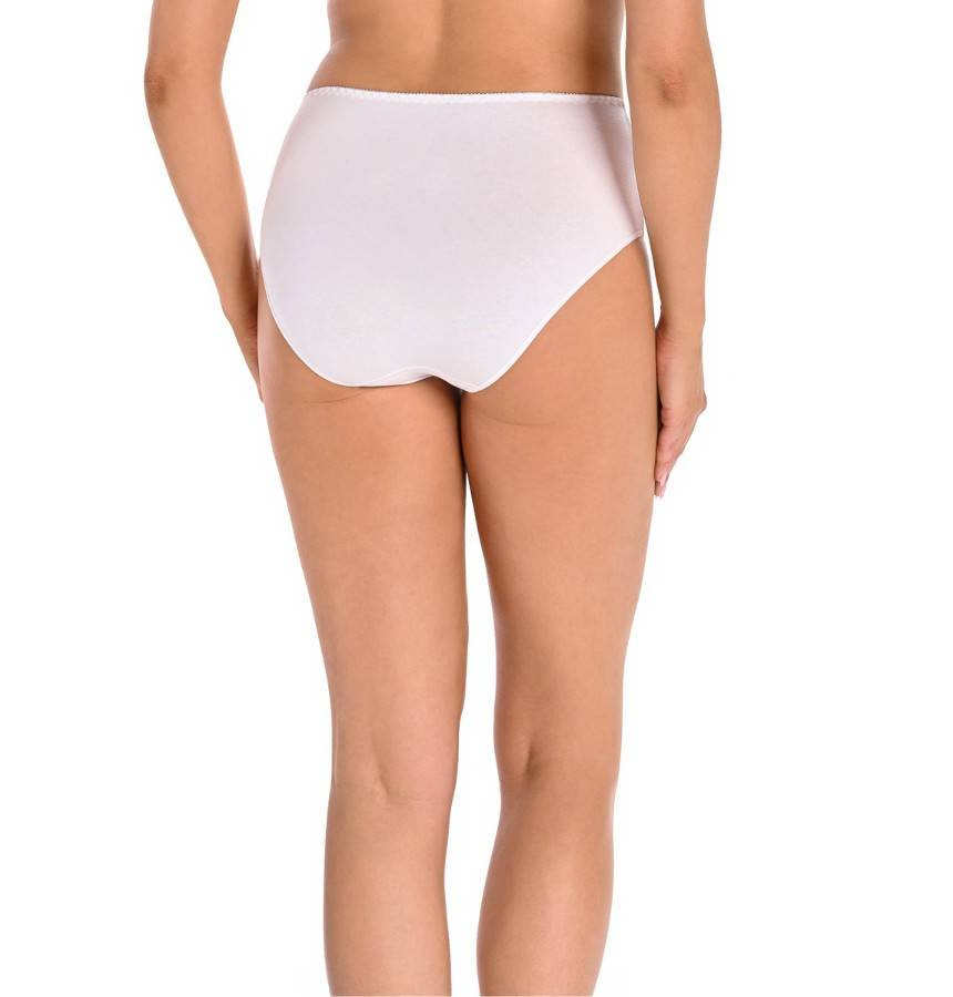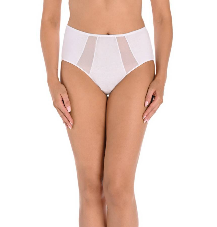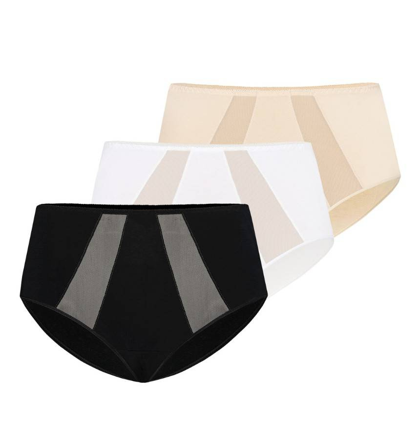 3-pak klasycznych majtek damskich z wysokim stanem. Są bardzo wygodne w codziennym użytkowaniu, z uwagi na wysoki stan i wysokie zabudowanie z boku kryją kobiece niedoskonałości. Z przodu majtki zestawione są z prześwitującą siatką o delikatnym drobnym splocie, która wszyta jest pod skosem, zdobi i nadaje efektowny wygląd. Z tyłu majteczki są mocniej zabudowane wykończone delikatną cienką elastyczną gumką, która idealnie dopasowuje się do pośladków, nie przecina ich, nie zostawia śladów na skórze.
