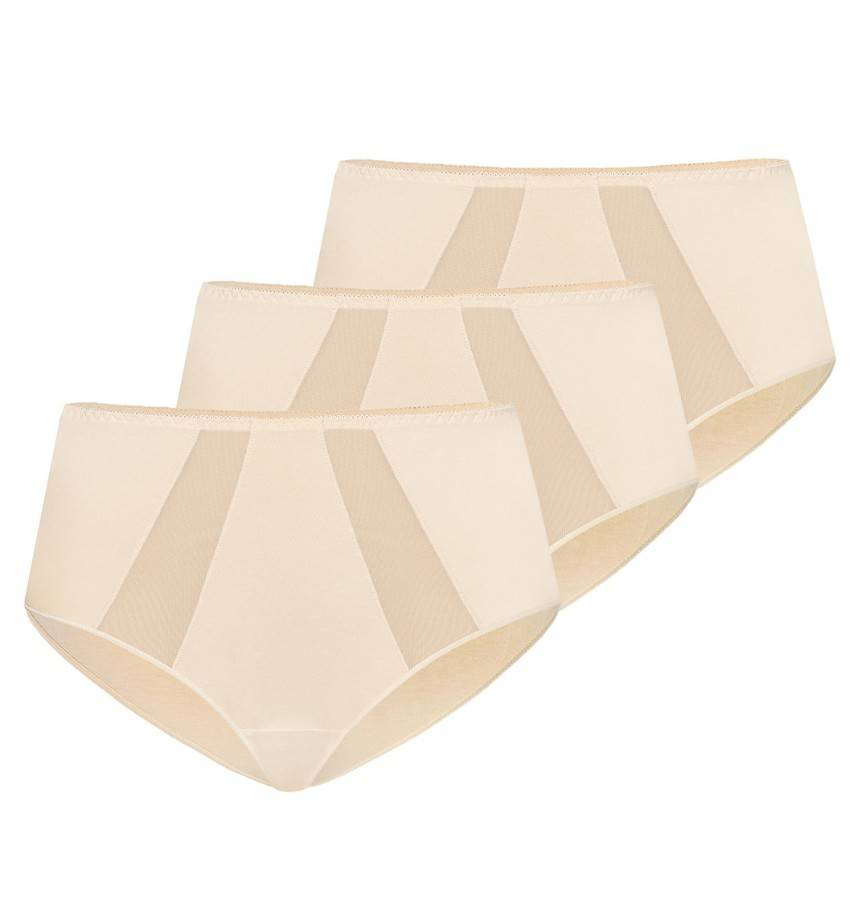 3-pak klasycznych majtek damskich z wysokim stanem. Są bardzo wygodne w codziennym użytkowaniu, z uwagi na wysoki stan i wysokie zabudowanie z boku kryją kobiece niedoskonałości. Z przodu majtki zestawione są z prześwitującą siatką o delikatnym drobnym splocie, która wszyta jest pod skosem, zdobi i nadaje efektowny wygląd. Z tyłu majteczki są mocniej zabudowane wykończone delikatną cienką elastyczną gumką, która idealnie dopasowuje się do pośladków, nie przecina ich, nie zostawia śladów na skórze.