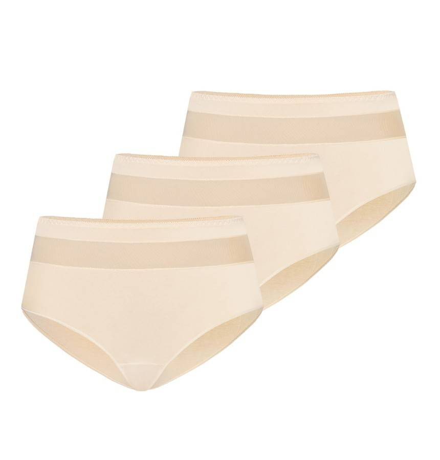 Damskie klasyczne w trzypaku. Efektowne majtki damskie z wysokim stanem sięgającym do połowy pępka. Z przodu zestawione są z prześwitującą delikatną o drobnym splocie siatką, która wszyta jest poziomo między warstwy materiału, dzięki temu podnosi walory estetyczne. Majtki wykonane są z wysokiej jakości delikatnej przewiewnej bawełny, która jest miła dla kobiecej skóry.
