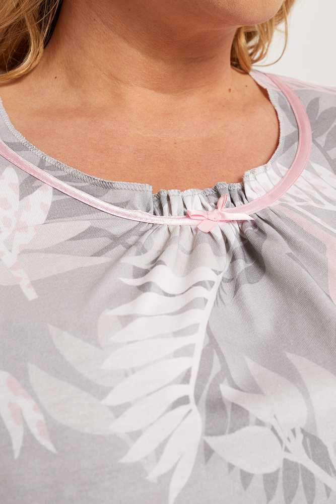 Piękna i subtelna piżama damska Bartonia została zaprojektowana w delikatnych, pastelowych kolorach. Bluzka uszyta jest z materiału pokrytego stonowanym i łagodnym wzorem w szaro-różowe liście na szarym tle. Okrągły dekolt został obszyty różową wstążką i ozdobiony kokardką w tym samym kolorze. Spodnie od piżamy to prosty fason z wysokim stanem i bezuciskową, komfortową gumą w pasie.