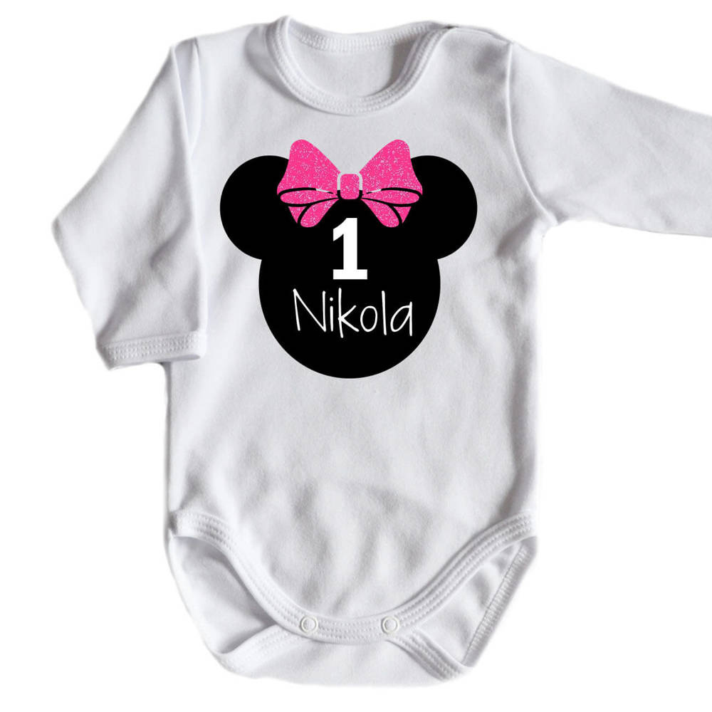 Body długi rękaw na roczek dla dziewczynki z myszką Moocha różowy