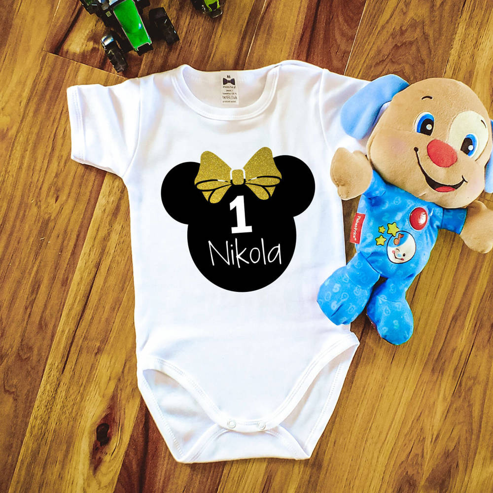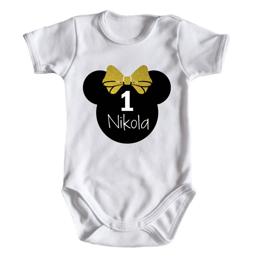 Body krótki rękaw na roczek dla dziewczynki z myszką Moocha złoty