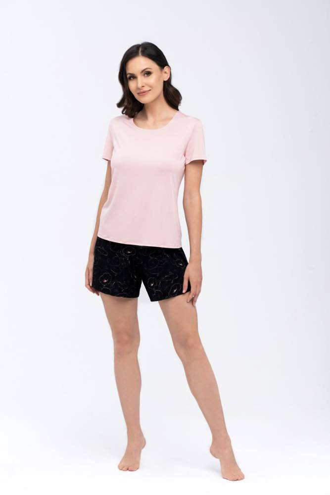 Koszulka z krótkim rękawem, gładka. Czarne spodenki w delikatny print.