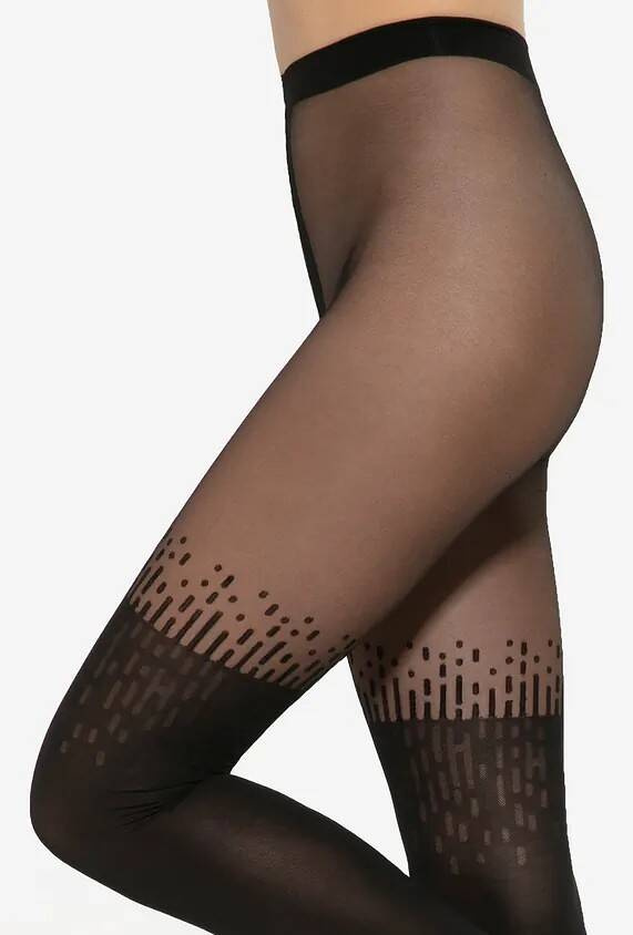 Rajstopy imitujące wzór pończochy z ozdobnym motywem. Wykonane w technologii 3D. Model bez zaznaczonej części majteczkowej, z małym klinem.