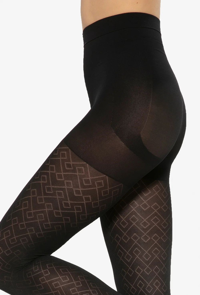 Wzorzyste rajstopy damskie wykonane z miękkiej mikrofibry. Posiadają specjalną konstrukcję części majteczkowej podnoszącą pośladki. Model bez zaznaczonych palców. Modelują sylwetkę.