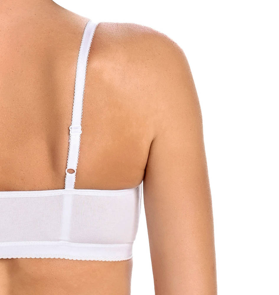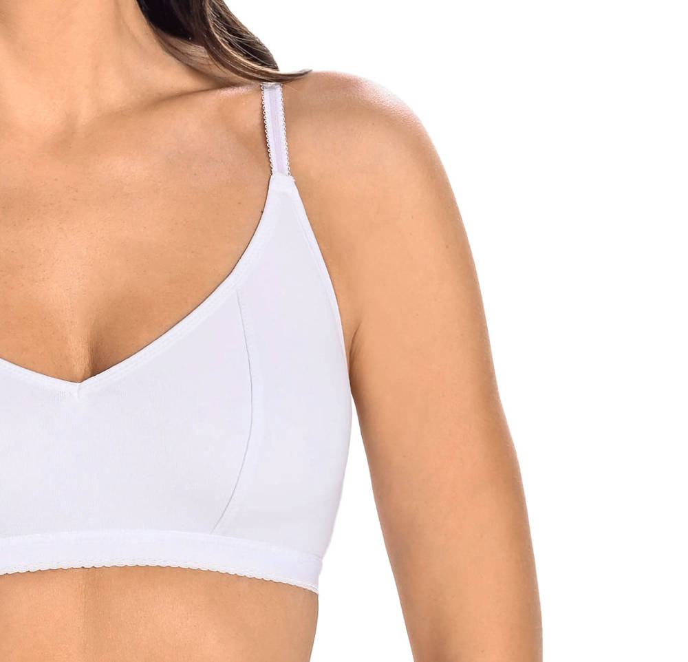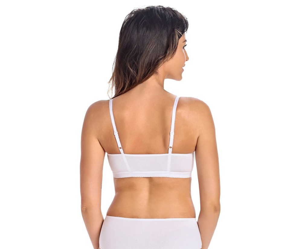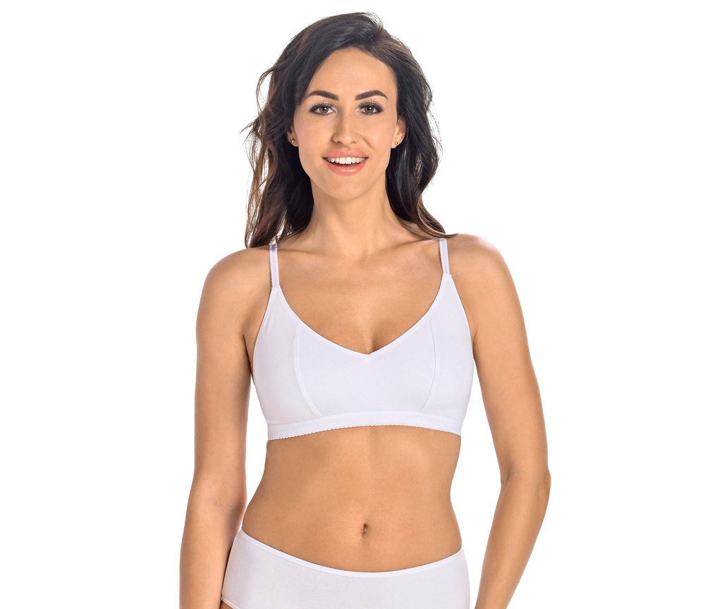 Stanik typu braletka bez fiszbin. Wysokiej jakości przewiewna bawełna gwarantuje komfortowe użytkowanie, a dodatek elastycznej nici lycry idealne dopasowanie do ciała. Cięcie pionowe w staniku modeluje piersi i nadaje im naturalny wygląd. Ramiączka biustonosza są regulowane, dostosowane do rozmiaru. Biustonosz damski zakładany jest przez głowę, nie posiada zapięć z tyłu pleców.