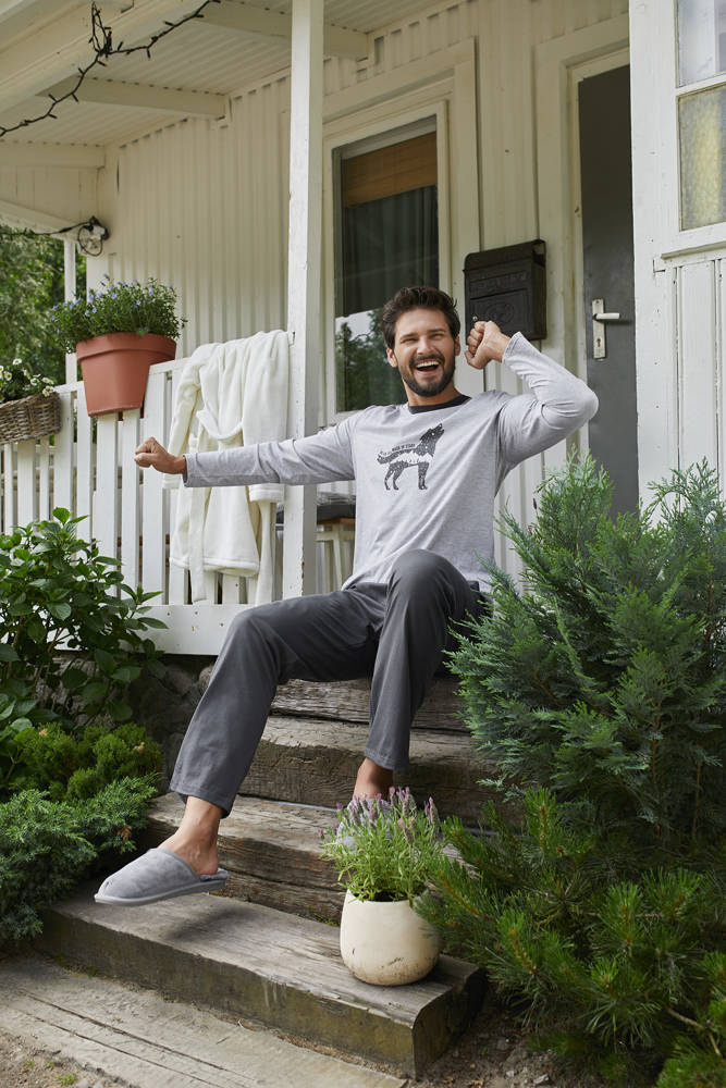 Piżama męska Tikal z długim rękawem i długimi spodniami jest idealną propozycją na sezon jesienno-zimowy. Dzięki stonowanej kolorystyce staje się elegancką i szykowną propozycją dla Panów. Piżama została zaprojektowana z dbałością o każdy detal. Materiał wykorzystany przy produkcji to w 100% bawełna. Spodnie od piżamy wyposażone są w kieszenie i bezuciskową gumę w pasie.