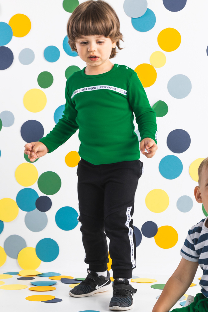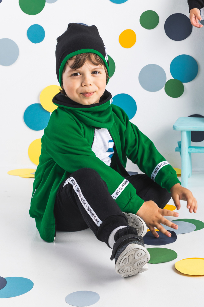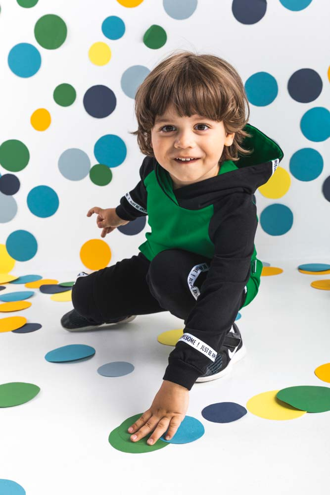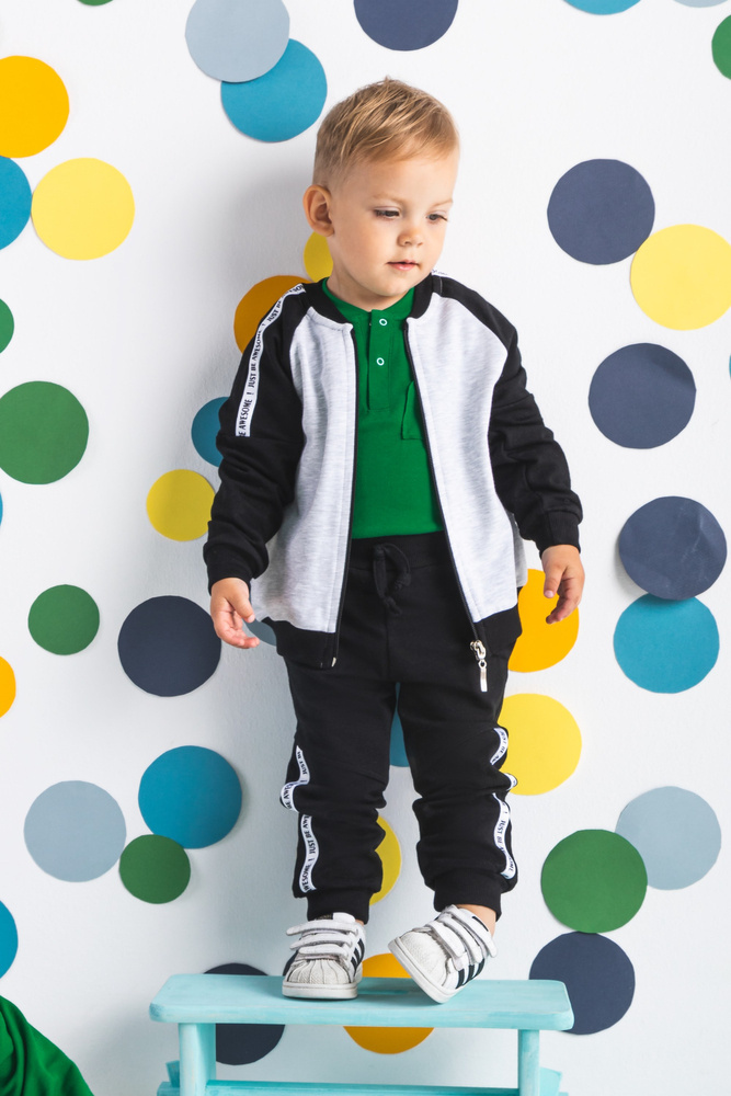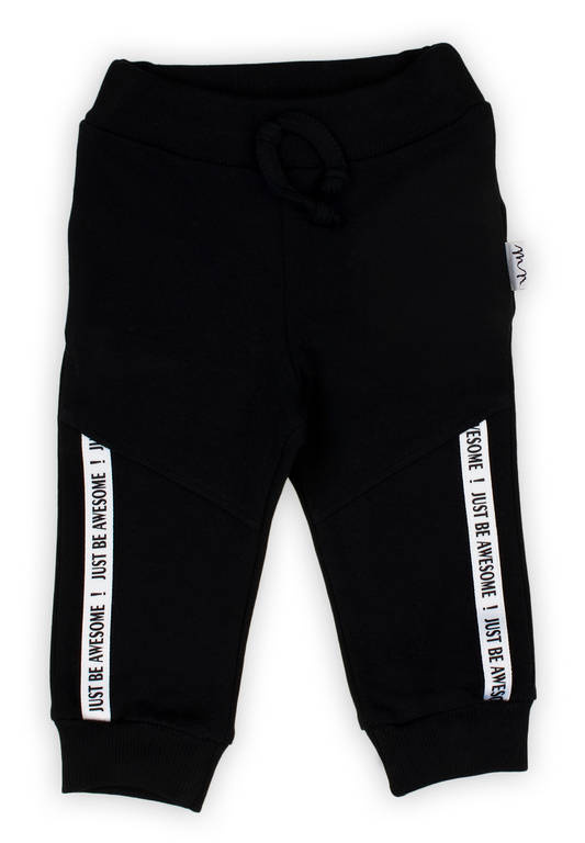 Modne spodnie dla chłopca wykonane z bawełny dresowej, która jest całkowicie bezpieczna dla skóry dziecka. Spodnie posiadają ściągacz w pasie oraz przy nogawkach.