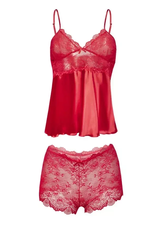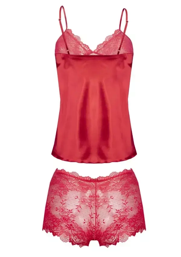 Seksowny, zmysłowy dwuczęściowy komplet składający się z koszulki oraz bokserek. Góra koszulki została uszyta z elastycznej zmysłowej koronki natomiast dół został wykonany z delikatnej satyny. Koszulka posiada cienkie, regulowane ramiączka. Bokserki zostały wykonane z elastycznej delikatnej koronki, która z całością tworzy niezapomniany komplecik.