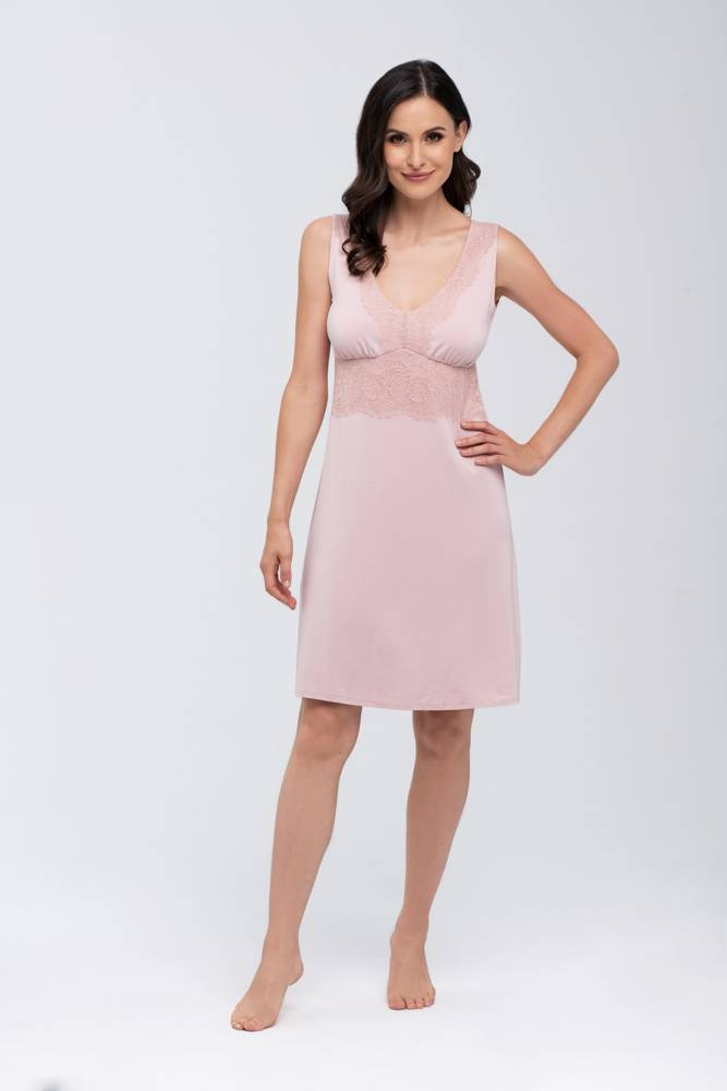 Delikatna koszula nocna na szerokim ramiączku. Bogato zdobiona koronką na dekolcie, w talii oraz na plecach. Marszczenie na biuście oraz doszyta pod nim gumka sprawiają, że to świetna propozycja także dla Pań z większym biustem.