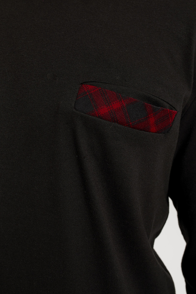 Zachwycająca swoją prostotą piżama męska Zeman, to idealne uzupełnienie kolekcji na zimowy czas. Zaprojektowana i uszyta z dbałością każdy element i sposób wykończenia zapewnia wysoką jakość i trwałość. Wykonana została w 100% z bawełny, tym samym gwarantując skórze komfort i przyjemność. Piżama składa się z bluzki na długi rękaw w kolorze czarnym z ozdobnym, kontrastowym obszyciem wokół dekoltu oraz kieszonki na piersi wykończonej materiałem z motywem nawiązującym do dołu piżamy.