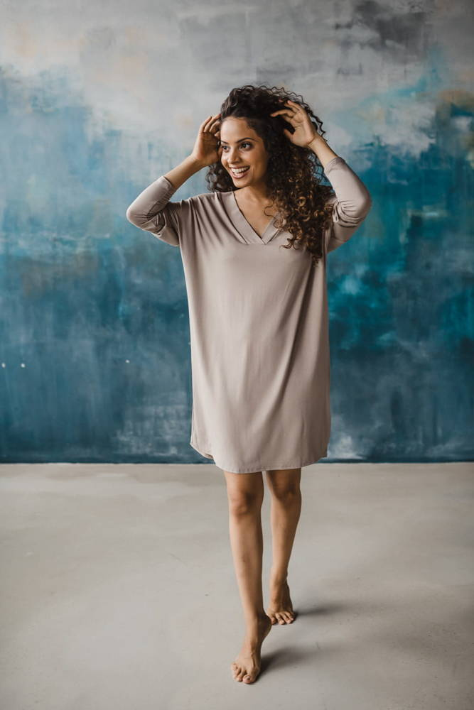 Koszula uszyta z wysokogatunkowej wiskozy bambusowej z dodatkiem elastanu, dzięki czemu nie "wyciąga się" i po praniu wraca do pierwotnego kształtu. Niezwykle elastyczna, dlatego świetnie sprawdzi się jako sukienka porodowa.