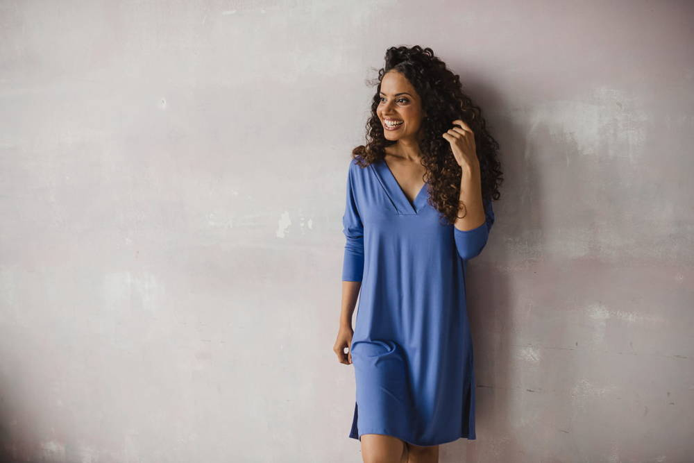Koszula uszyta z wysokogatunkowej wiskozy bambusowej z dodatkiem elastanu, dzięki czemu nie "wyciąga się" i po praniu wraca do pierwotnego kształtu. Niezwykle elastyczna, dlatego świetnie sprawdzi się jako sukienka porodowa.