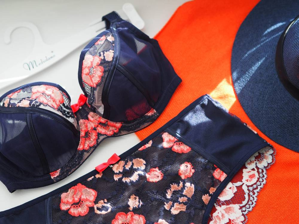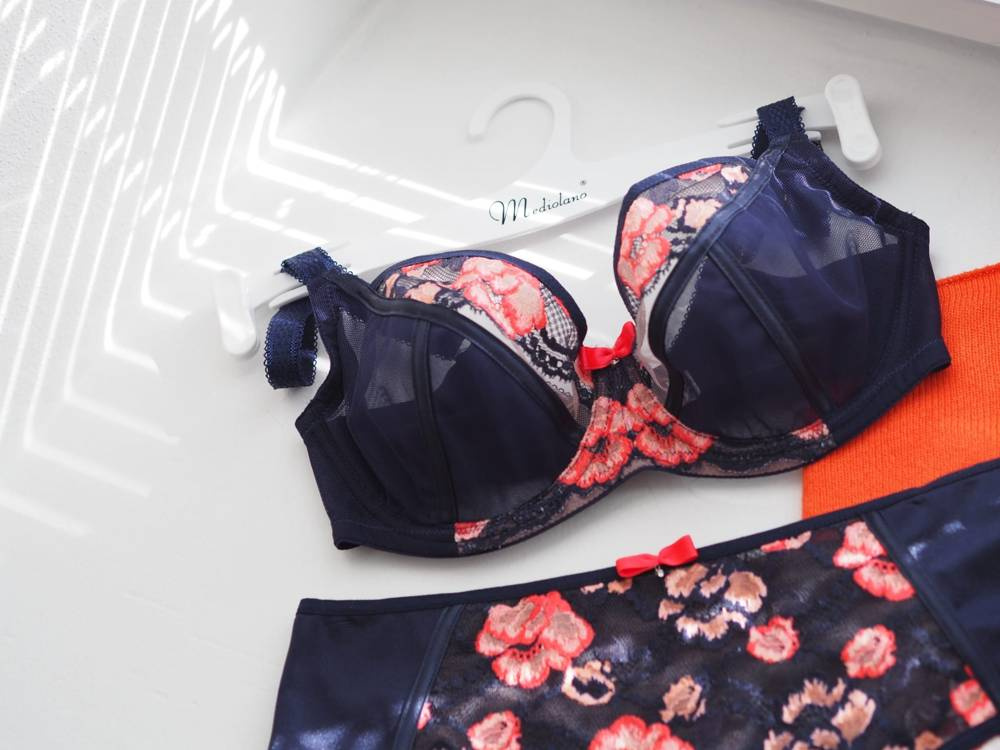 Miseczki wykonane ze specjalnej siatki, która zapewnia podtrzymanie biustu i komfort użytkowania. Dolna część miseczki z granatowej mikrofibry, góra z koronki w kwiaty, koronka zdobi również bawet. Idealne sprawdzi się na duży i średni biust, konstrukcja unosi biust i eksponuje dekolt.