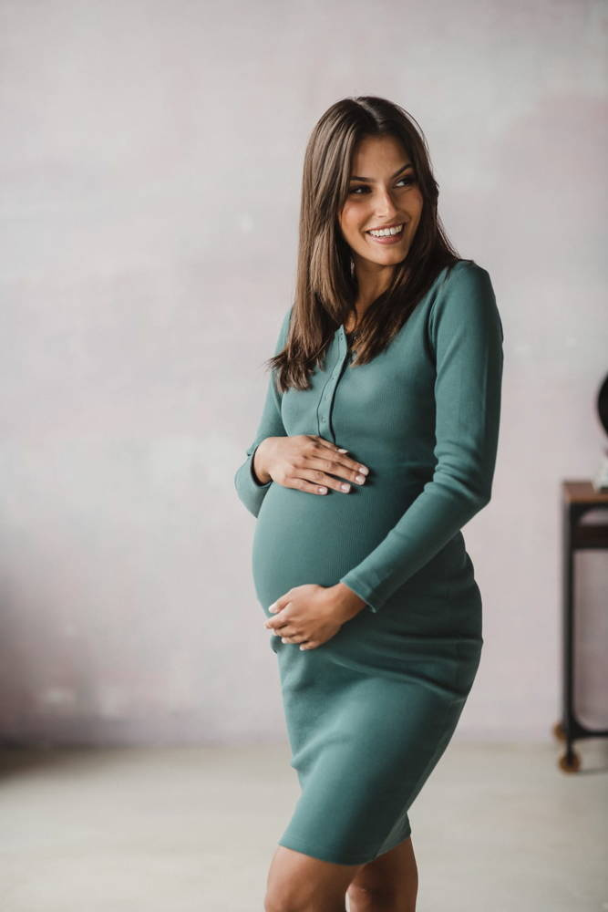 Wygodna sukienka ciążowa uszyta z wysokiej jakości dzianiny, która się nie odkształca! Ma dopasowany krój, a dzięki napom przy dekolcie swobodnie nakarmisz w niej maluszka. Można ją nosić także po ciąży, jako zwykłą sukienkę typu bodycon! Idealna na co dzień i na specjalne okazje Została uszyta z miękkiej dzianiny, która przeszła rygorystyczne testy Oeko-Tex Standard 100. Bawełniana dzianina zachowuje gładkość i głęboki kolor nawet po wielu praniach. Uszyta w Polsce!