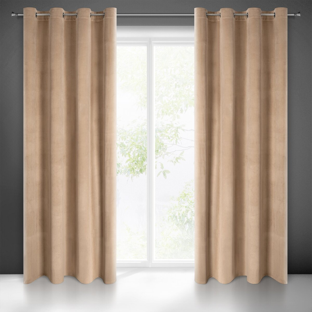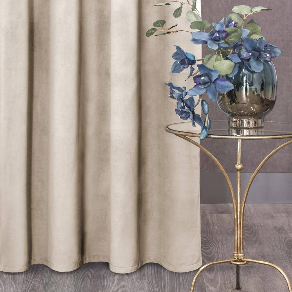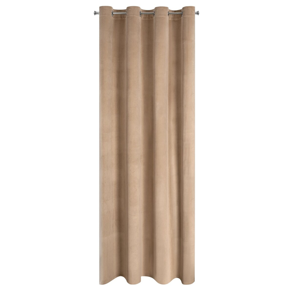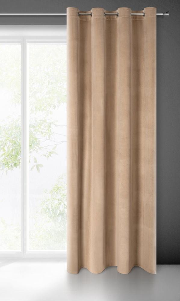 Zasłona z jednokolorowej welwetowej tkaniny o aksamitnej strukturze i subtelnym połysku. Miękka tkanina o aksamitnej strukturze sprawia, że zasłona zjawiskowo odbija światło i znakomicie prezentuje się po zawieszeniu. Ze względu na swoją gęstość tkanina dobrze kryje okno - w dzień przed promieniami słonecznymi, a wieczorami przed spojrzeniami z zewnątrz. Stosując się do instrukcji konserwacji masz pewność, że po praniu tkanina nie kurczy się ani nie wymaga pracochłonnego prasowania.