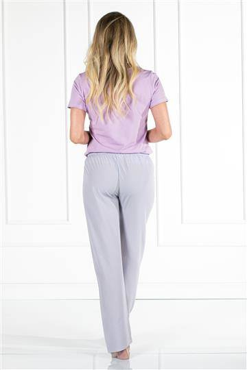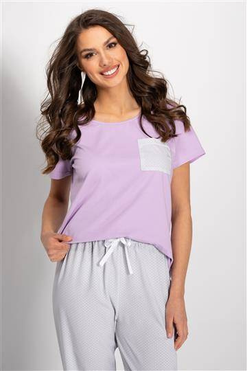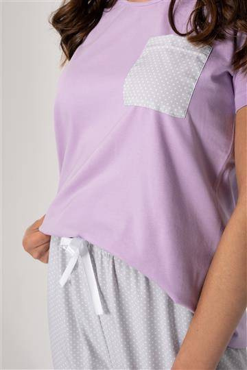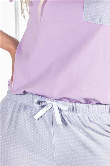 Piżama damska wykonana z przyjemnej w dotyku, miękkiej dzianiny. Dekolt typy U. Na wysokości piersi znajduje się kieszonka. Luźny, komfortowy krój, w pasie ozdobna kokardka.