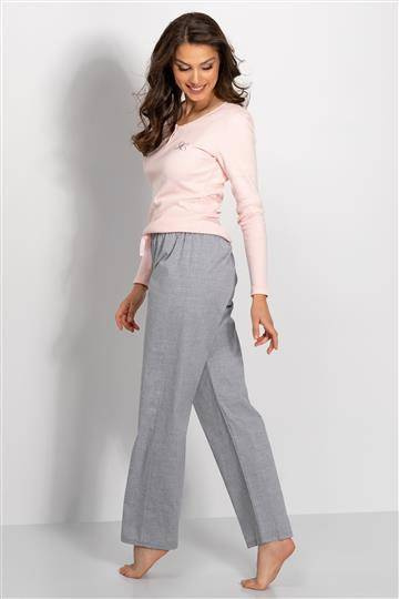 Piżama damska wykonana z przyjemnej w dotyku, miękkiej dzianiny w prążek. Dekolt typy U. Na wysokości piersi znajduje się haft.  Luźny, komfortowy krój, w pasie ozdobna kokardka.