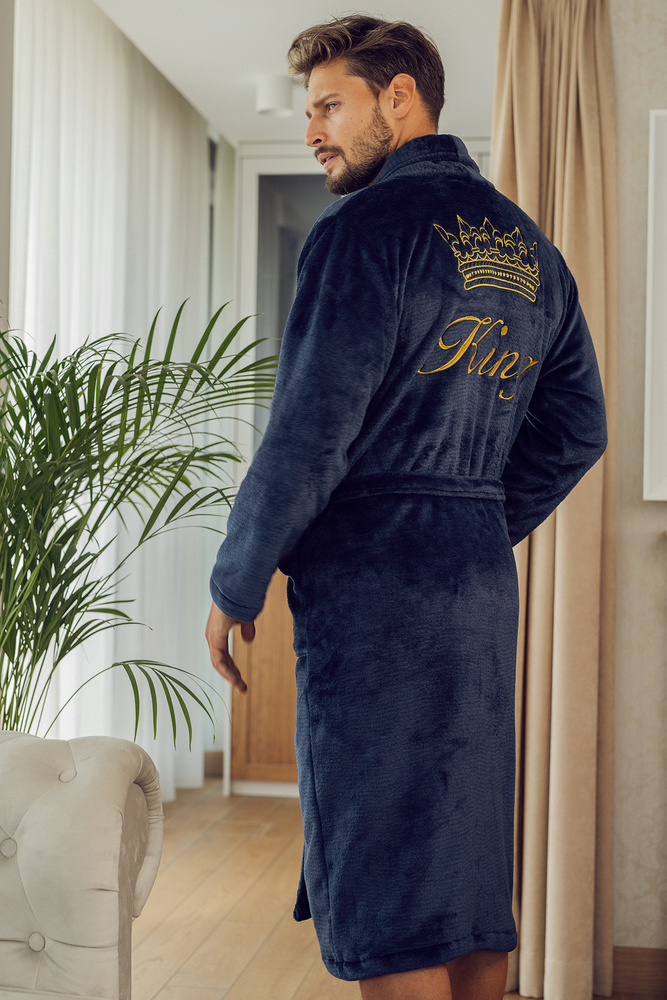 King + Korona Szlafrok męski polarowy ByShelly - granatowy/złoty