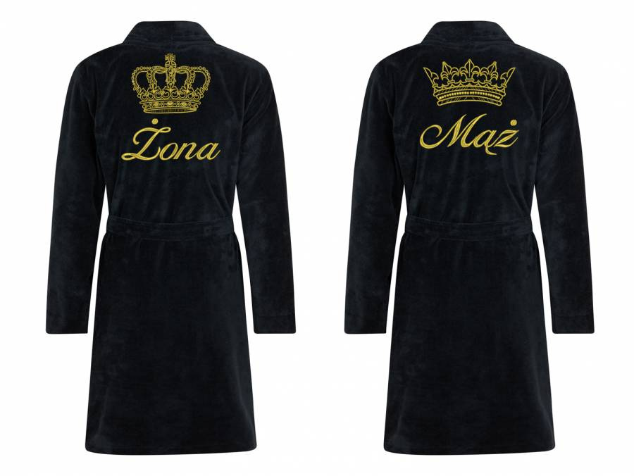 Zestaw niezwykle ciepłych i przyjemnych w dotyku szlafroków. W skład zestawu wchodzi szlafrok damski i męski ze złotym napisem i koroną.