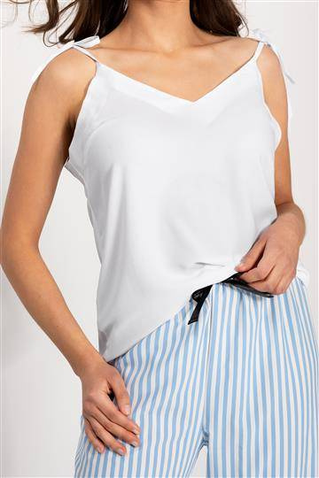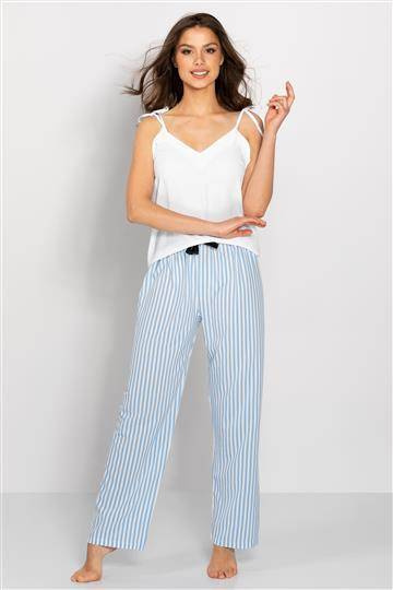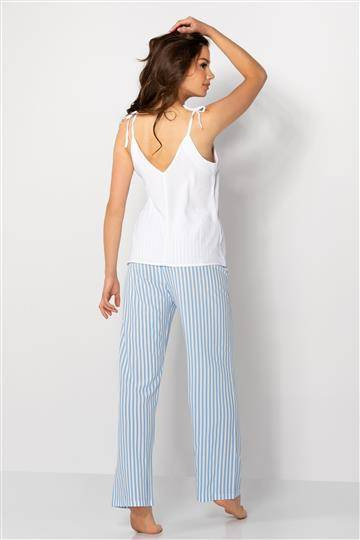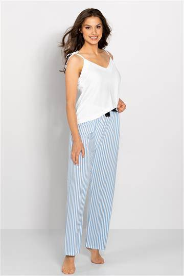 Piżama damska wykonana z przyjemnej w dotyku, miękkiej dzianiny. Luźny krój. Dekolt szpic z tyłu i przodu koszulki. Spodnie bez kieszeni.