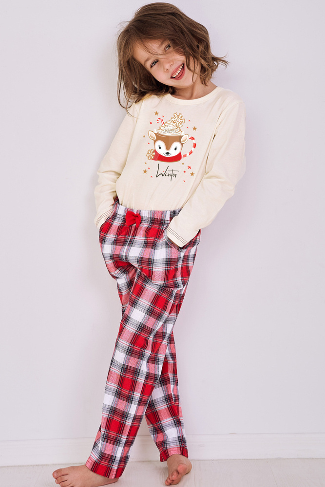 Piżama dziewczęca uszyta z wysokiej jakości bawełny. Koszulka z długim rękawem, całość ozdobiona kolorowym, świątecznym nadrukiem.