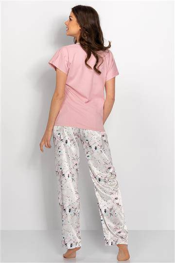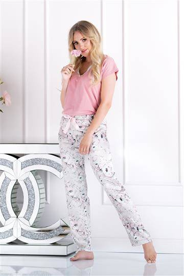 Elegancka i stylowa piżama damska. Klasyczne spodnie wykonane z delikatnej, srebrzystej satyny, zdobione kwiecistym printem w stylu watercolour. Krój luźny, wygodny, zrabny. T-shirt w delikatnym, pudroworóżowym kolorze wykończony satynową lamówką na V-dekolcie.