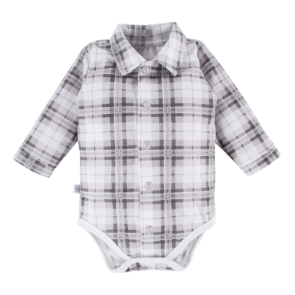 Body chłopięce koszulowe z długim rękawem z kolekcji "Ceremony" uszyte z miękkiej i przyjemnej w dotyku tkaniny. Krój umożliwia całkowite rozpięcie, przez co ubranko jest funkcjonalne i wygodne. Dół body wykończony jest miękką lamówką. Napki użyte w naszych wyrobach nie zawierają niklu. Wyprodukowane w Polsce, posiadają certyfikat "Bezpieczny dla dziecka".