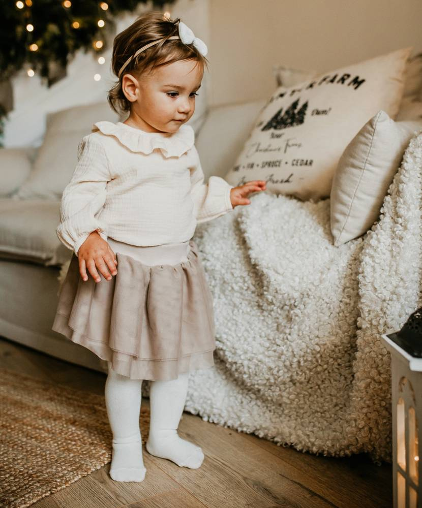 Spódnica z kolekcji Ceremony uszyta z miękkiej i przyjemnej w dotyku dzianiny i tiulu. W pasie znajduje się guma nie uwierająca brzuszka dziecka.