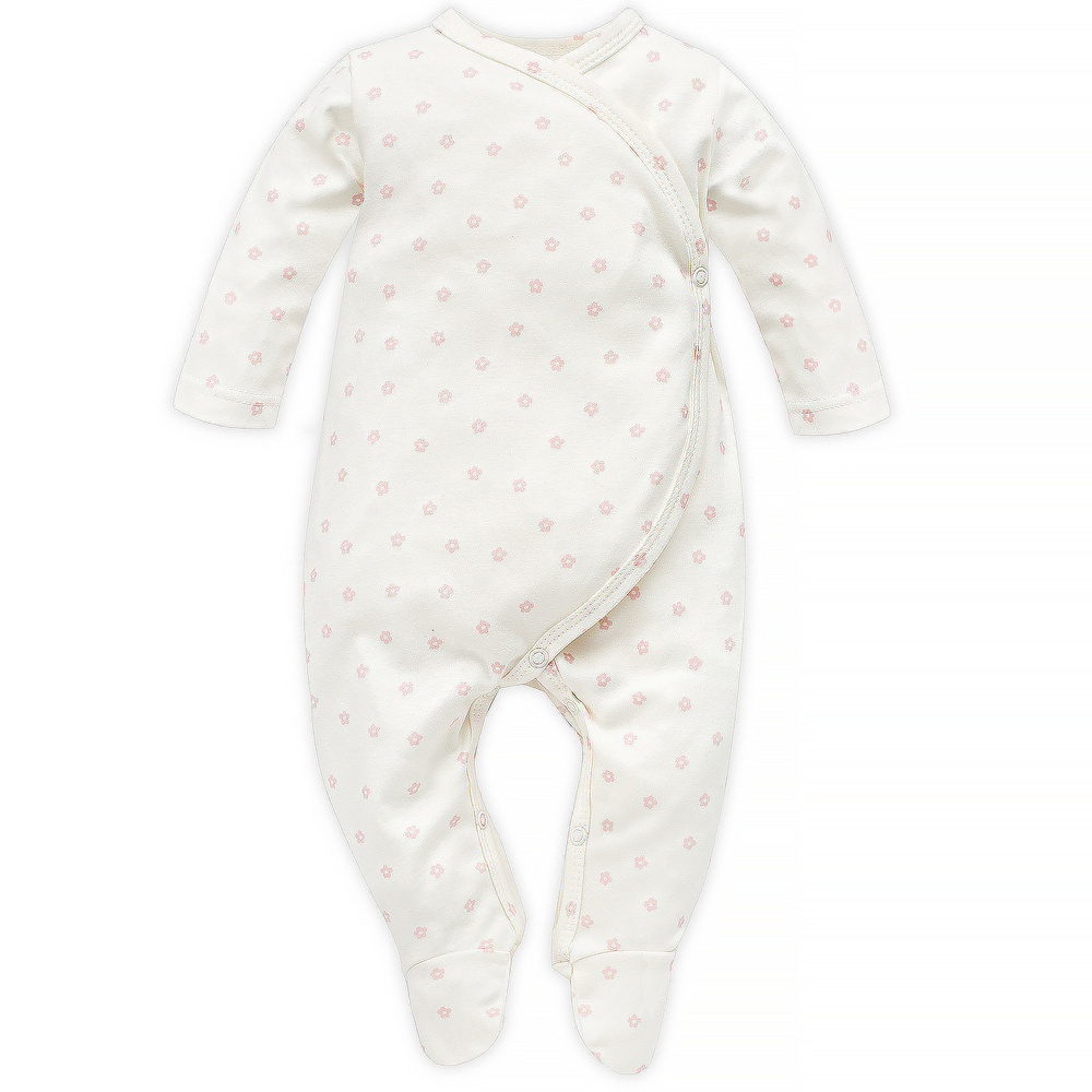 Wygodny bawełniany pajac zapinany w kroku na bezniklowe napki. Na jednym boku pajac zapinany jest na napę, a spodnia część przodu wiązana jest bawełnianą tasiemką.