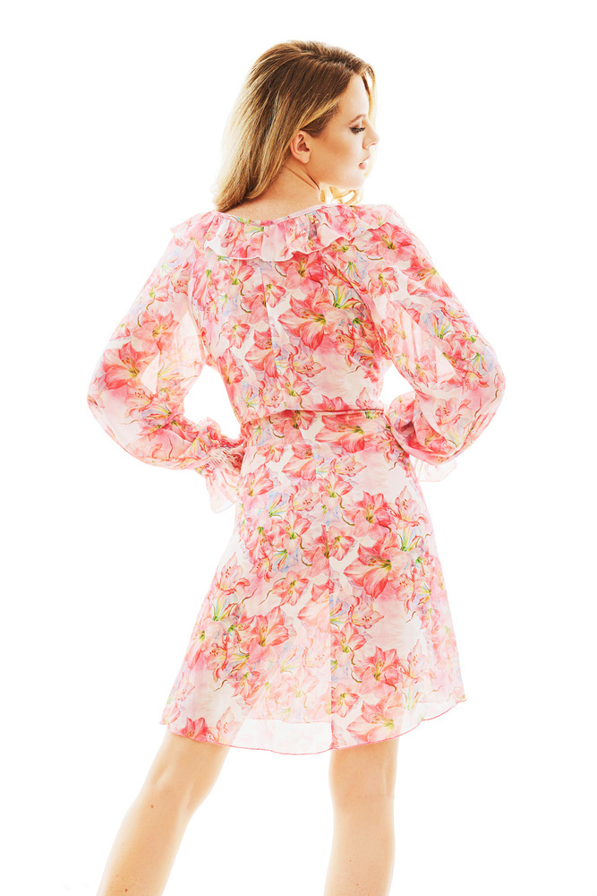 Szyfonowy peniuar z romantycznymi rękawami z falbankami i gumeczkami na przegubach dłoni.