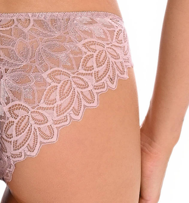 Brazyliany wykonane są z wysokiej jakości elastycznej koronki o wyrazistym i gęstym motywie roślinnym, która efektownie prezentuje się na pośladkach i eksponuje je. W pasie majteczki wykończone są cienką elastyczną gumką, która nie zostawia śladów na skórze, nie przecina w pasie. W kroku od wewnątrz wykończone są delikatną bawełną gwarantującą utrzymanie świeżości w trakcie użytkowania. Majtki brazylijskie osiadają małe zdobienia w formie delikatnych kółeczek, które znajdują się z przodu na biodrach.