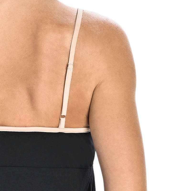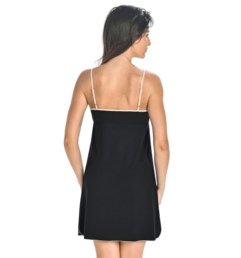 Damska koszula nocna w kolorze czarnym na cienkich regulowanych ramiączkach, wykonana z wysokiej jakości, przewiewnego materiału. Długością sięga do połowy uda, po bokach ma dwa małe półokrągłe rozcięcia. Pod biustem koszulka jest odcinana i delikatnie marszczona, jej kształt to literka A. Koszula nocna wokół dekoltu i dołem jest estetycznie obszyta cienką tasiemką w kolorze ecru. Delikatne kokardki tego samego koloru pięknie zdobią koszulkę na dekolcie. Dzięki rozkloszowanemu fasonowi koszulka nie opina sylwetki i jest wygodna podczas użytkowania.