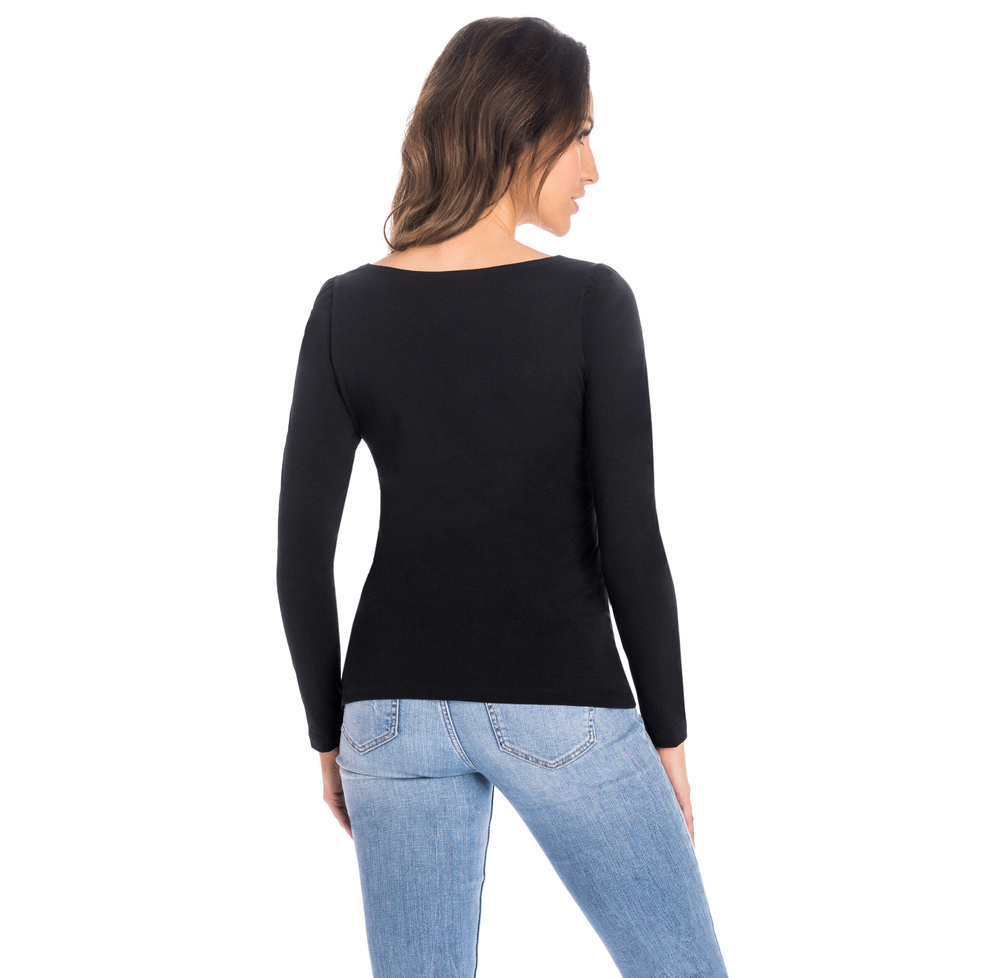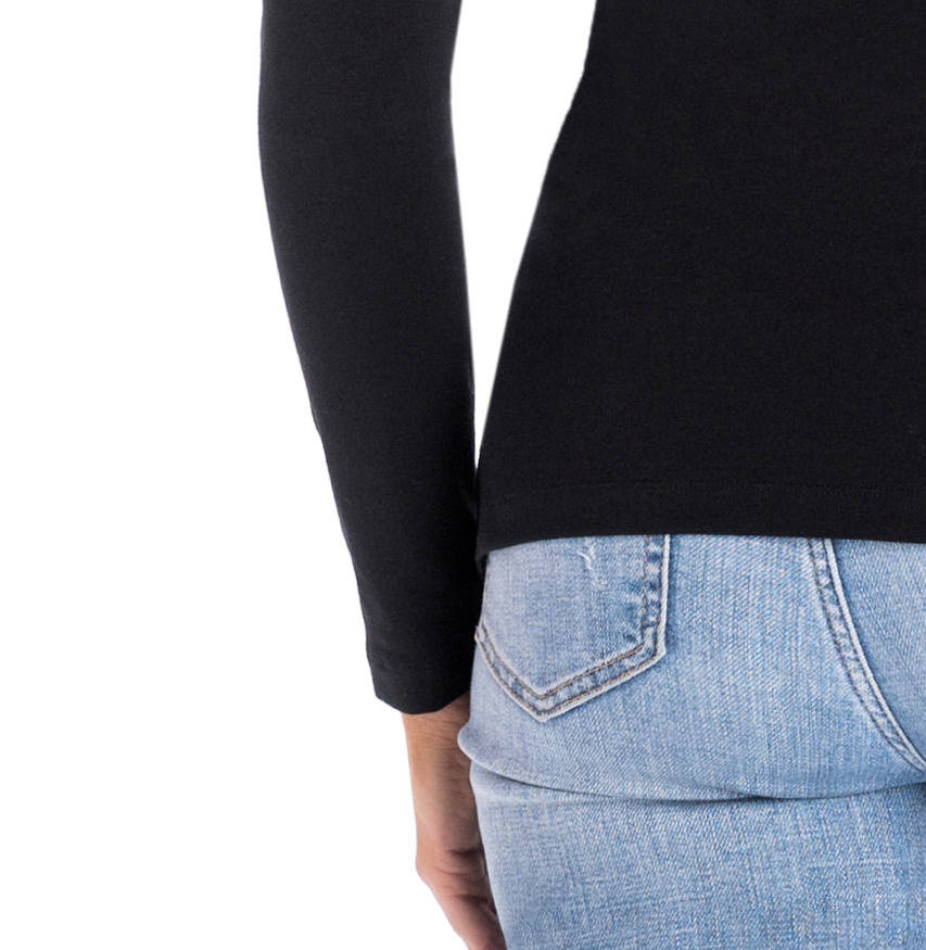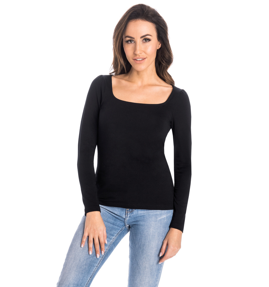 Bawełniana dopasowana czarna bluzka z długim dopasowanym rękawem. Posiada w swoim składzie włókno lycry, dzięki któremu bluzka nie rozciąga się, nie zmienia fasonu po praniu, idealnie podkreśla kształty sylwetki. Długością sięga do połowy bioder, komponuje się z dopasowaną ołówkową spódnicą i spodniami. Wokół szyi koszulka bawełniana wykrojona jest w kształcie prostokąta, podkreśla dekolt i eksponuje biust. Bluzka sprawdza się w codziennych stylizacjach do pracy do spodni, spódnicy i marynarki.