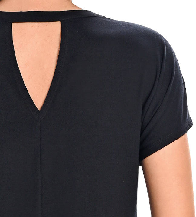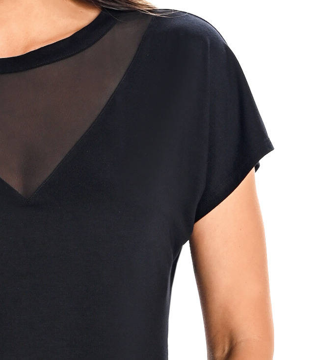 Bambusowa koszulka damska z krótkim rękawem w kolorze czarnym. W swoim składzie oprócz bambusa posiada elastyczne włókno, dzięki któremu idealnie dopasowuje się do sylwetki. Z przodu na dekolcie łączona jest z lekko prześwitującą siatką o drobnym splocie. Wokół szyi, bluzka wykończona jest z cienką stójką, a z tyłu na plecach posiada rozcięcie w kształcie trójkąta. Bluzeczka jest do połowy bioder, lekko dopasowana. Bambusowe włókno gwarantuje komfortowe użytkowanie, posiada właściwości antybakteryjne, jest przewiewne, delikatne dla skóry i adresowane do osób cierpiących na alergię