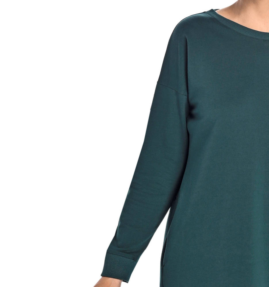 Sukienka damska o klasycznym kroju. Wysokiej jakości przewiewna bawełna gwarantuje komfortowe użytkowanie. Sukienka po bokach z obu stron posiada dwie wpuszczane kieszonki, a długością sięga do kolan. Dołem wykończona jest szerszym elastycznym ściągaczem, to samo wykończenie jest na rękawach, które są długie i idealnie przylegają do rąk. Wokół szyi sukienka wykończona jest estetycznie na półokrągło. Z lewej strony przy nodze z przodu naszyte jest delikatne logo firmy. Sukienka bawełniana jest adresowana do kobiet lubiących proste fasony i kochających wygodę.