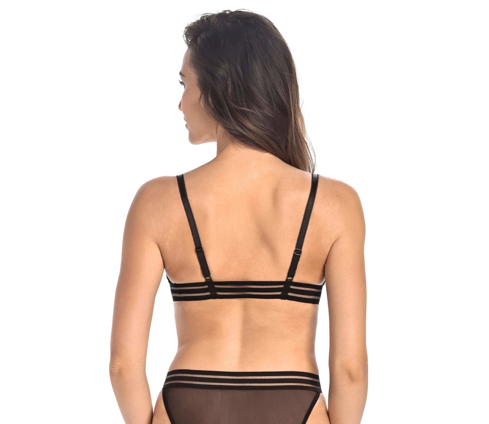 Braletka damska wykonana z delikatnej siatki o drobnym splocie. Stanik wykonany jest z dwóch prześwitujących trójkątów z pionowym cieciem na misce, które delikatnie unosi pierś do góry. Braletka posiada cienkie ramiączka, które łatwo wyregulować i dostosować ich długość do potrzeb. Zakładana jest przez głowę, w obwodzie pod biustem wykończona bardzo estetycznie szerszą, elastyczną ozdobną gumką składającą się z trzech cienkich paseczków, która idealnie podtrzymuje piersi i dodaje efektownego wyglądu. Stanik damski jest bardzo wygodny w codziennym użytkowaniu.