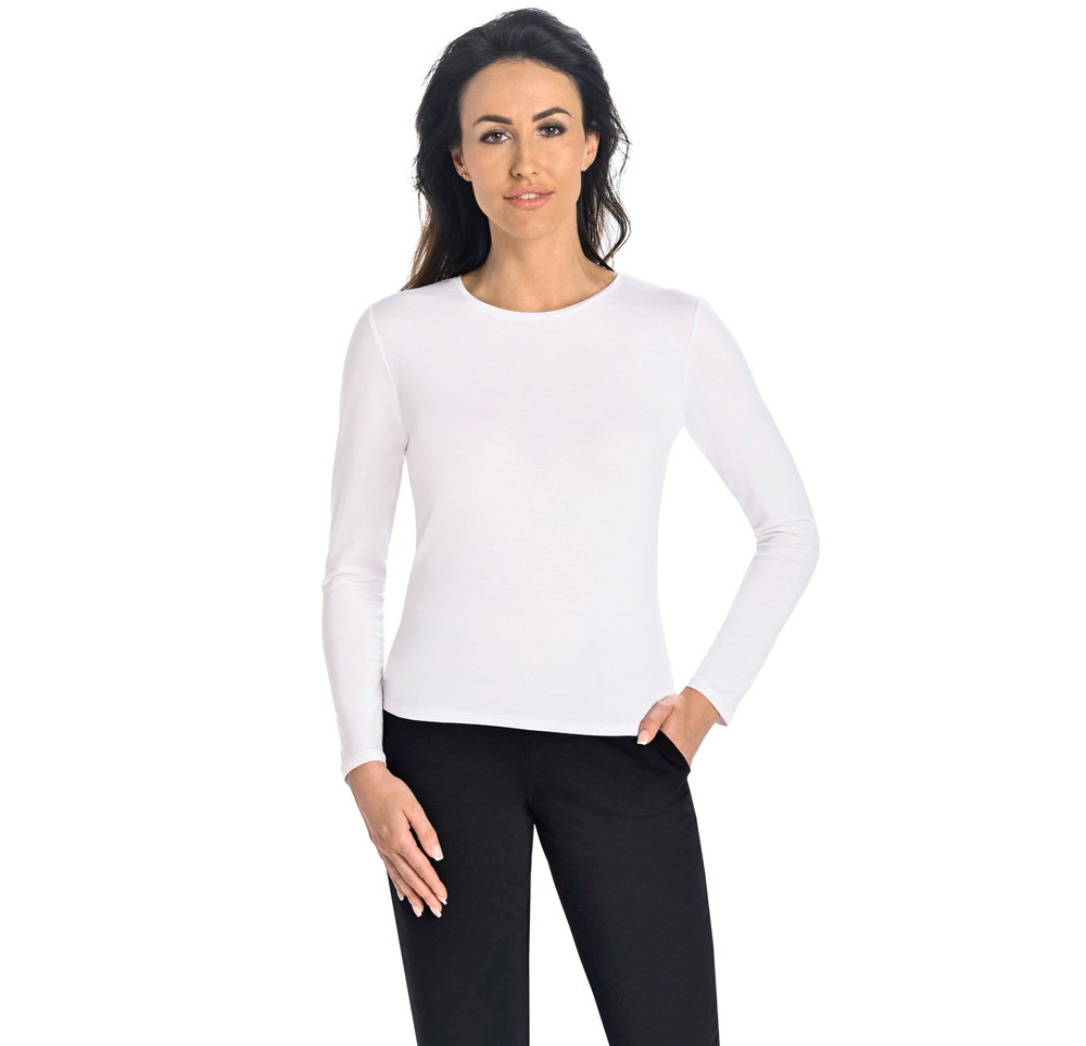 Damska koszulka mocno dopasowana do sylwetki z długim rękawem. Wykonana jest z wysokiej jakości delikatnego dla kobiecej skóry przewiewnego włókna bambusa, który ma właściwości antybakteryjne i jest wskazany dla kobiet z alergią. Dodatkowo zawiera w swoim składzie niewielką ilość elastycznego włókna lycry, dzięki temu idealnie przylega do sylwetki, podkreślając jej zalety. Koszulka damska długością sięga do połowy bioder, fantastycznie komponuje się z dopasowanymi jeansami i legginsami. Bambusowy podkoszulek to konieczny must have każdej współczesnej kobiety kochającej klasykę i ceniących sobie wygodę.