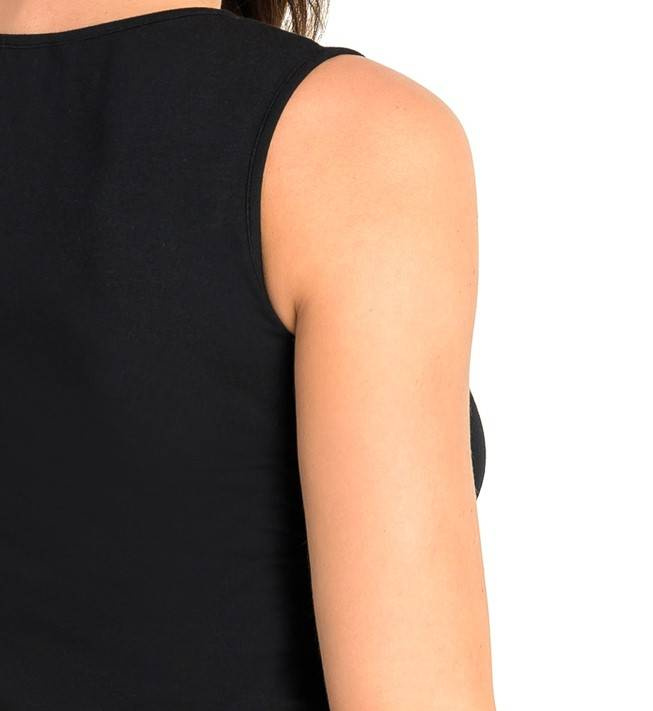 Damska tunika na szerszych ramiączkach w czarnym kolorze. Wykonana jest z wysokiej jakości przewiewnej bawełny z dodatkiem włókna lycry. Dzięki temu składowi, tunika idealnie oplata kobiecą sylwetkę, a także podkreśla i eksponuje jej zalety. Posiada półokrągły dekolt, który ładnie uwydatnia kobiecą szyję. Długością sukienka bawełniana sięga do połowy uda, może być noszona zarówno do eleganckich szpilek, jak i obuwia sportowego.
