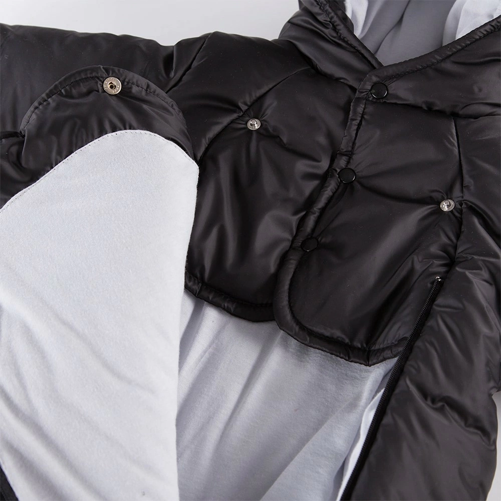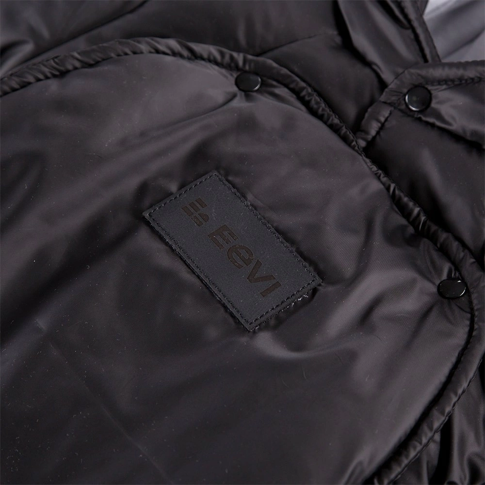 Kombinezon niemowlęcy z kolekcji "EEVI" w kilku wersjach kolorystycznych uszyty z miękkiej i przyjemnej w dotyku tkaniny odzieżowej stanowiącej doskonałą ochronę dziecka przed chłodem, deszczem oraz wiatrem. Posiada dodatkową warstwę ocieplacza. Wewnątrz wyłożony jest bawełną. W kapturze kombinezonu została wszyta gumka, która zapobiega odstawaniu kapturka i chroni główkę dziecka przed zimnem. Kombinezon odpinany na dwa zamki. Na przodzie znajduje się naszywka wykonana z eko-skórki.