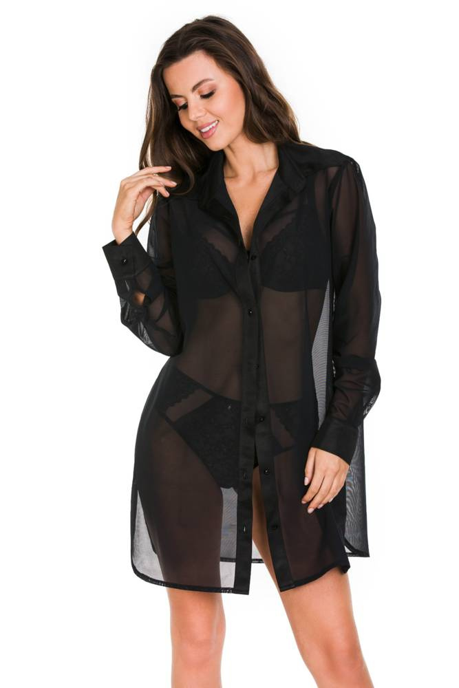 Elegancka koszula wykonana z tiulu. Satynowy kołnierzyk, mankiety i listwy z guzikami. Na bokach rozcięcie.