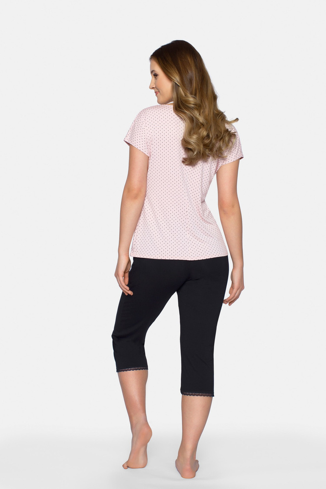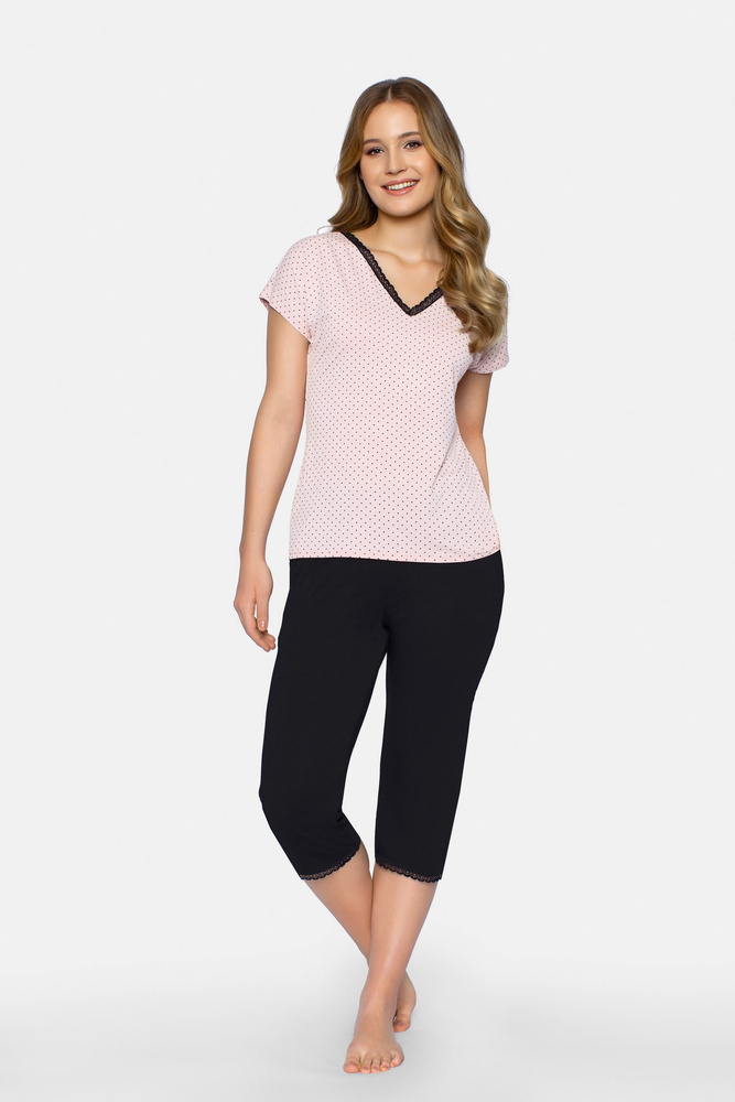 Model wykonany z miłej wiskozy. Koszulka z krótkimi rękawkiem , w kropki. Dekolt w literę V. Do kompletu spodnie typu rybaczki gładkie.