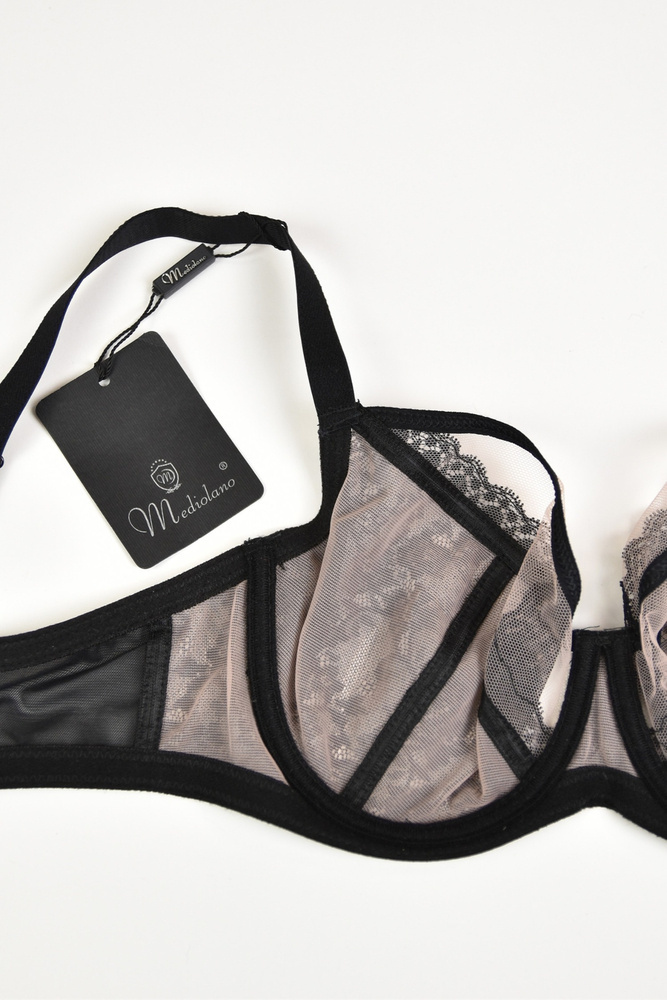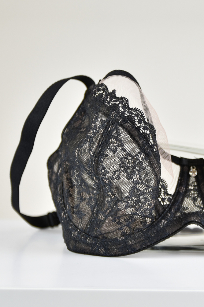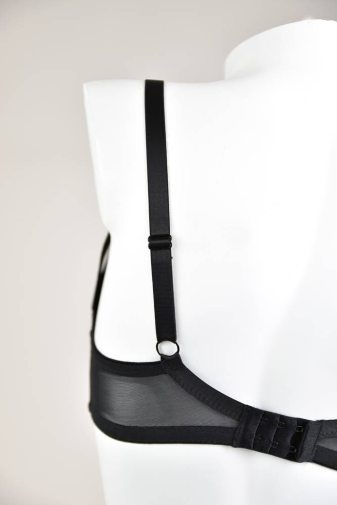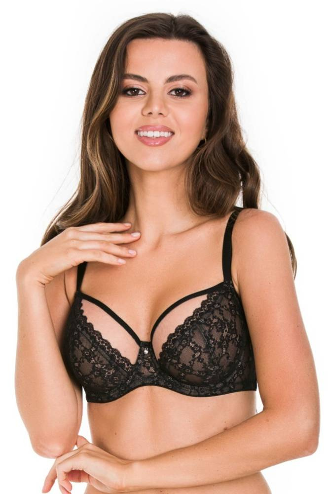 Miseczki z tiulu, dół pokryty koronką. boczki wykonane ze stabilnego materiału, wzmocnione boczną fiszbiną. Ramiączka regulowane, nie odpinają się. Konstrukcja idelanie podtrzymuje biust.