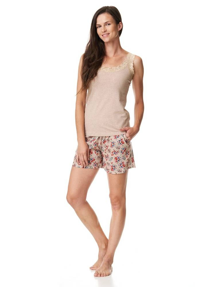 Do kompletu krótkie wzorzyste spodenki z wygodnymi kieszeniami