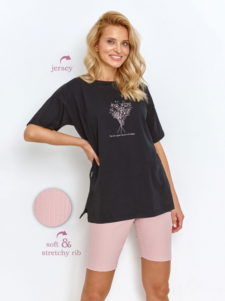 Piżama damska wykonana z wysokiej jakości bawełny. Koszulka o luźny kroju, z krótkim rękawem, jednolita z nadrukiem o motywie florystycznym. Obcisłe, krótkie spodenki typu kolarki wykonane z miękkiego, elastycznego materiału w prążek.