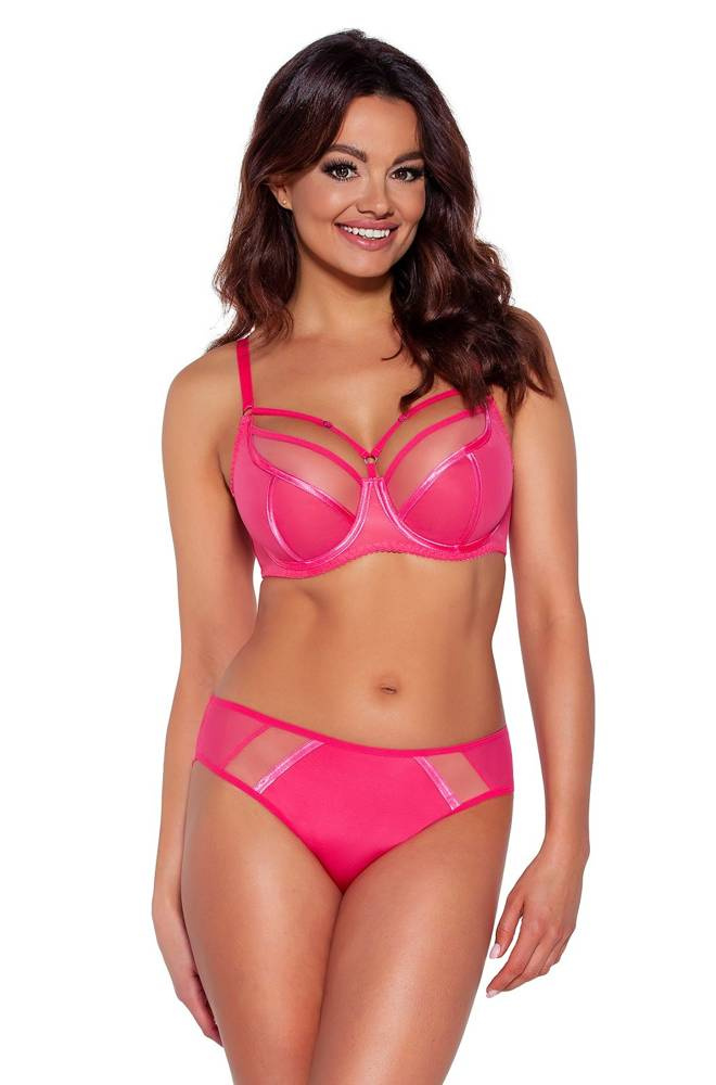 Pełne uroku, kobiece figi typu brazyliany wykonane z miłej i przyjemnej dla ciała mikrofibry i tiulowej siateczki z satynowymi przeszyciami z połyskującą nitką lurex.