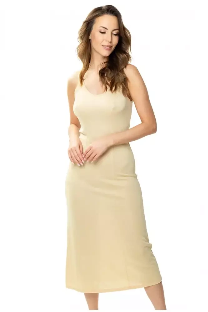 Koszulka ma niestandardową długość za kolano, dzięki czemu może służyć nie tylko jako halka, ale również jako koszula nocna. Posiada cięcia francuskie, które pozwalają na idealne dopasowanie do krągłości naszego ciała. Szerokie ramiączka zapobiegają wbijaniu się w skórę przy większych rozmiarach. Posiada także ładnie wyprofilowany dekolt podkreślający kobiece atuty. Ze względu na unikatowe właściwości jedwabiu wiskozowego VISTEX® produkt ten jest idealny dla osób o wrażliwej skórze