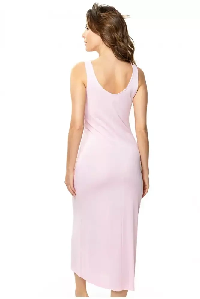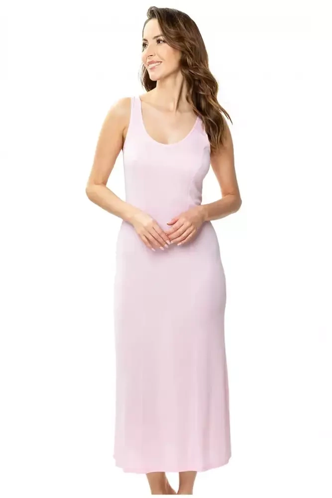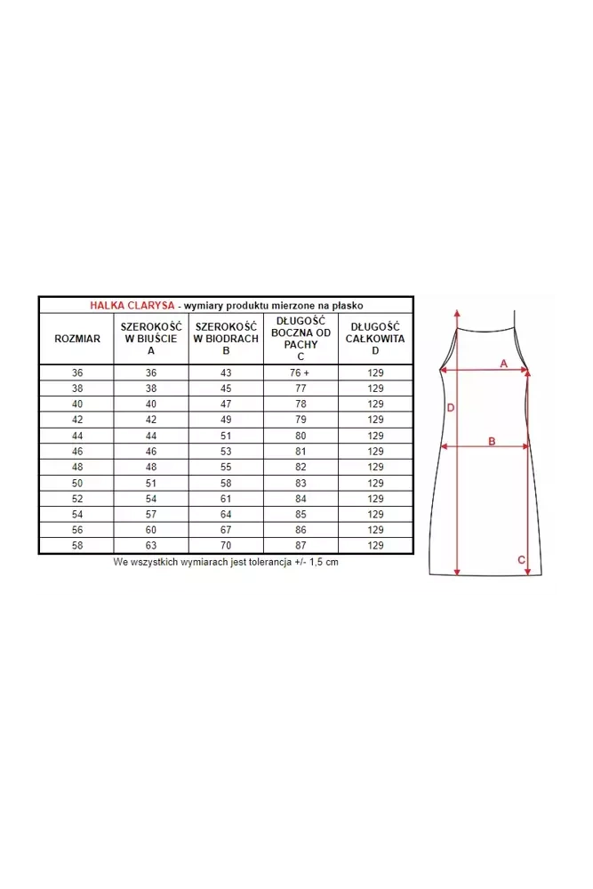 Koszulka ma niestandardową długość za kolano, dzięki czemu może służyć nie tylko jako halka, ale również jako koszula nocna. Posiada cięcia francuskie, które pozwalają na idealne dopasowanie do krągłości naszego ciała. Szerokie ramiączka zapobiegają wbijaniu się w skórę przy większych rozmiarach. Posiada także ładnie wyprofilowany dekolt podkreślający kobiece atuty. Ze względu na unikatowe właściwości jedwabiu wiskozowego VISTEX® produkt ten jest idealny dla osób o wrażliwej skórze